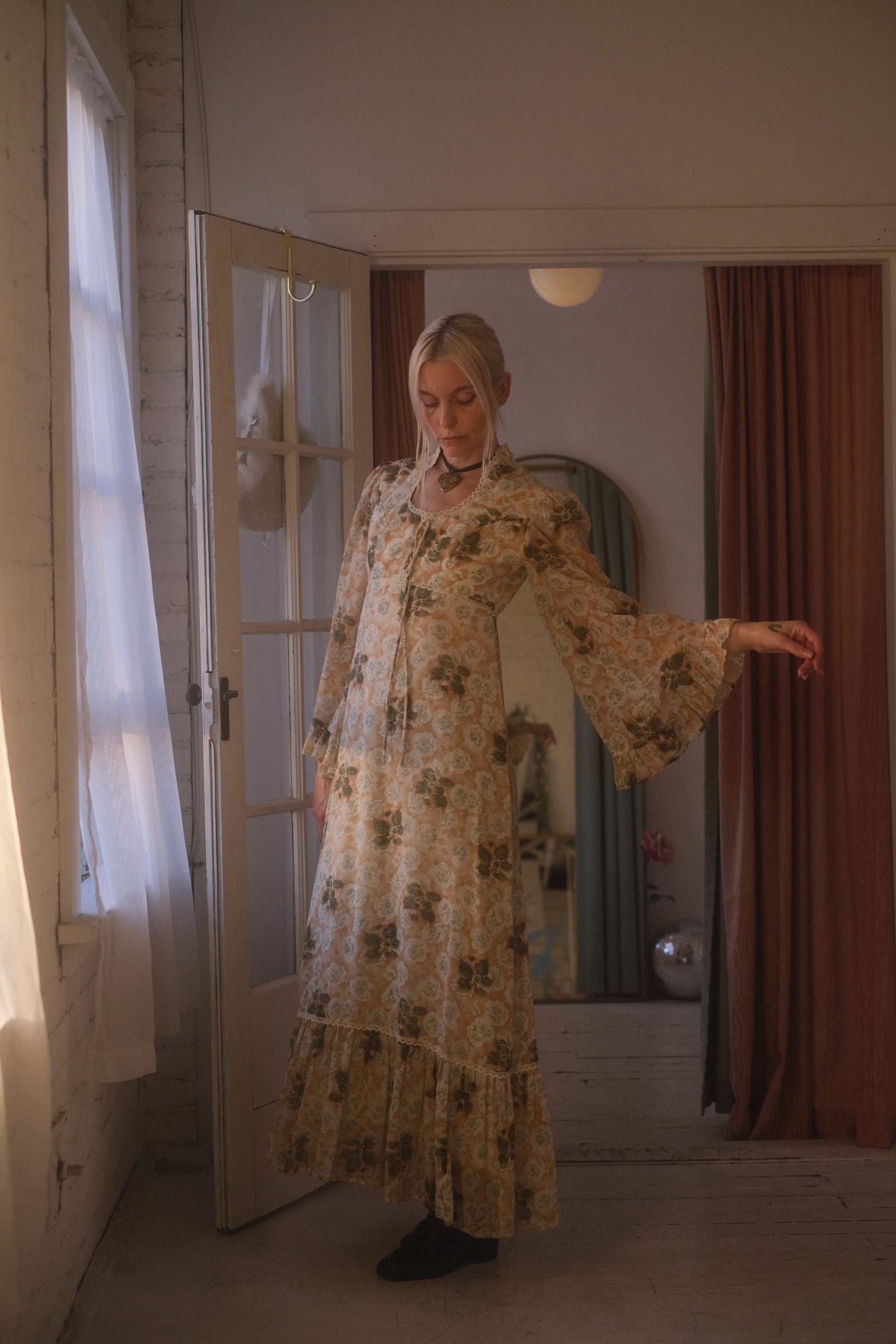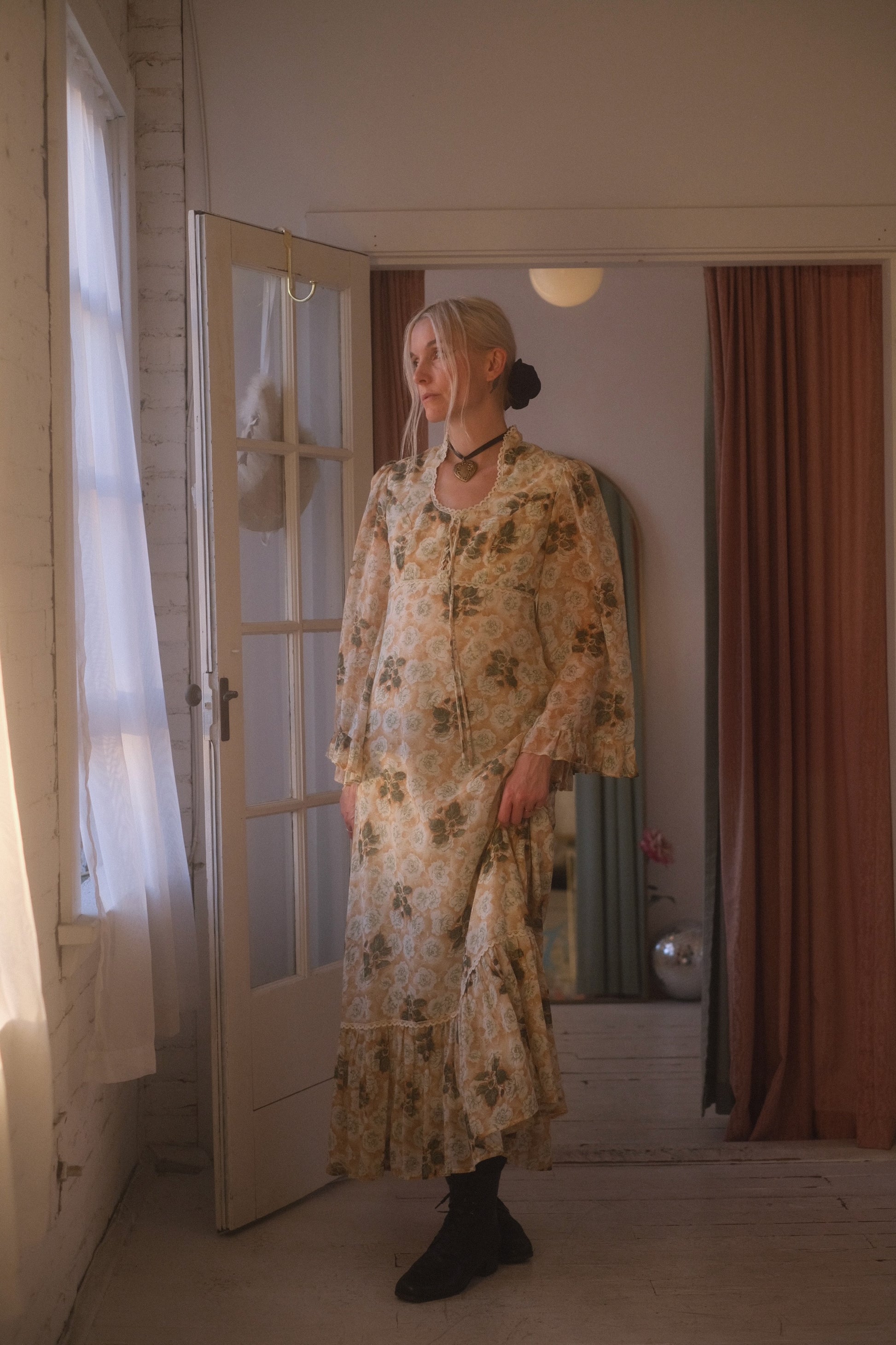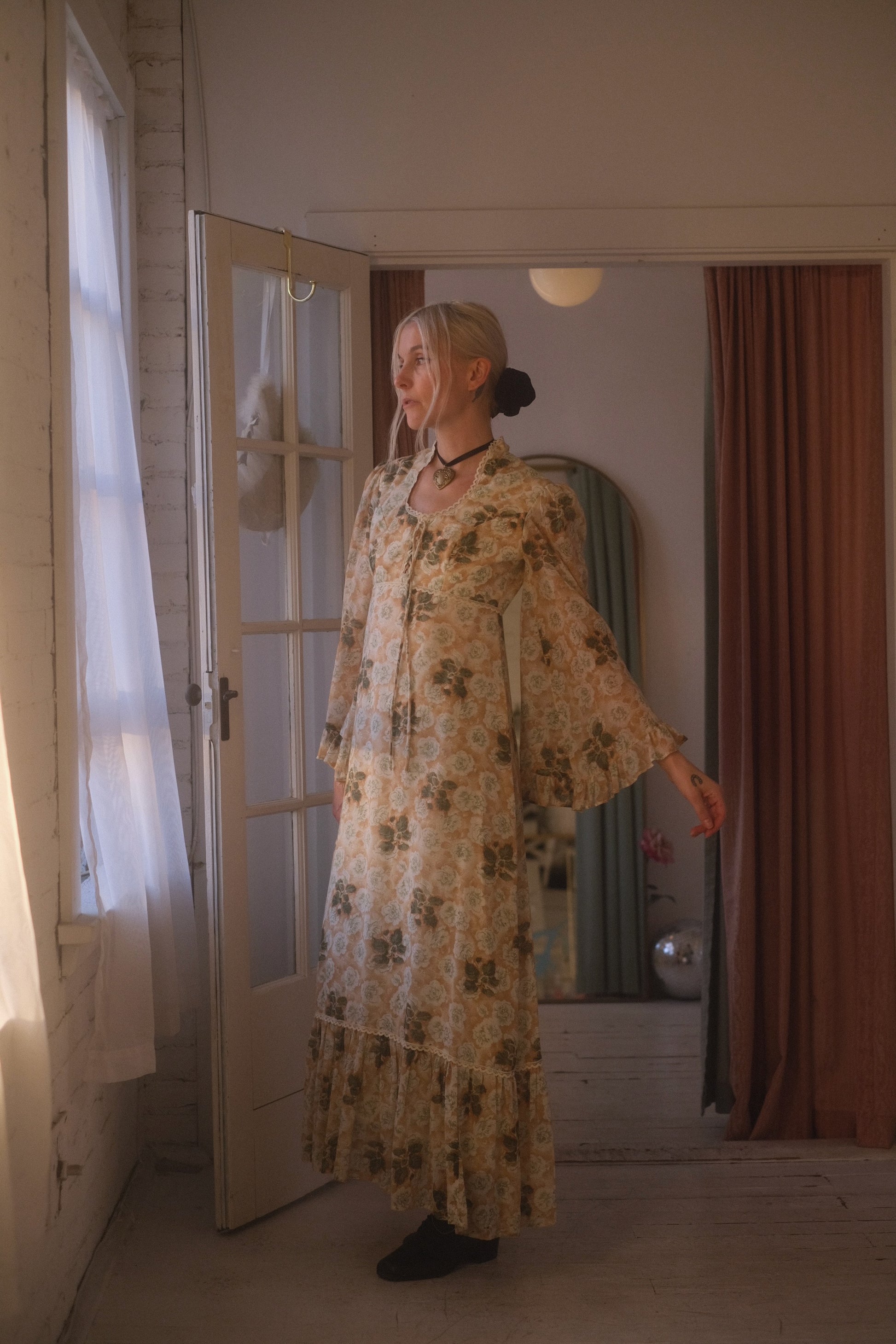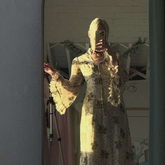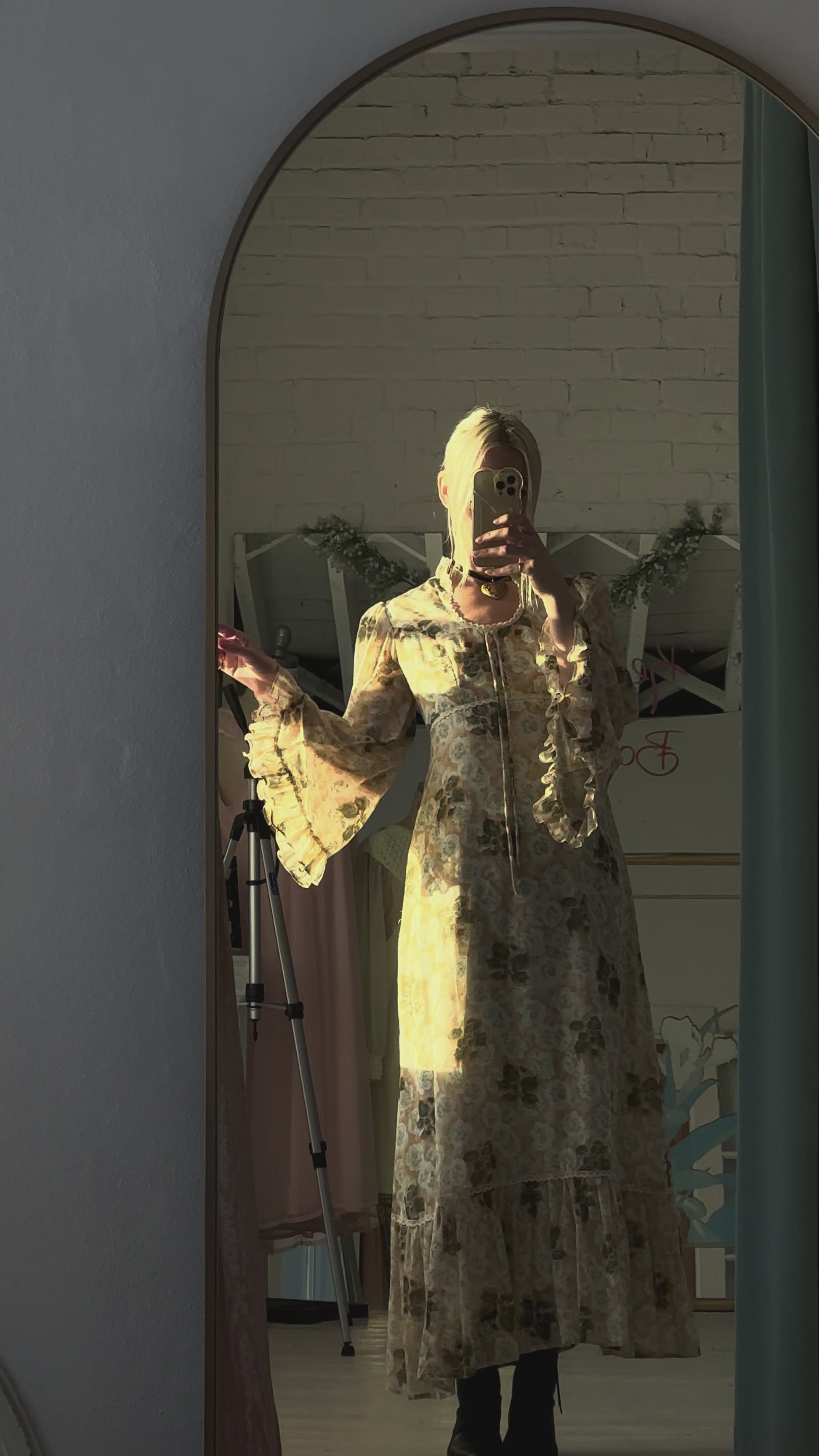 Gorgeous floral dress, beautiful sleeve, pretty neckline, flowing, romantic skirt, lined - great condition.