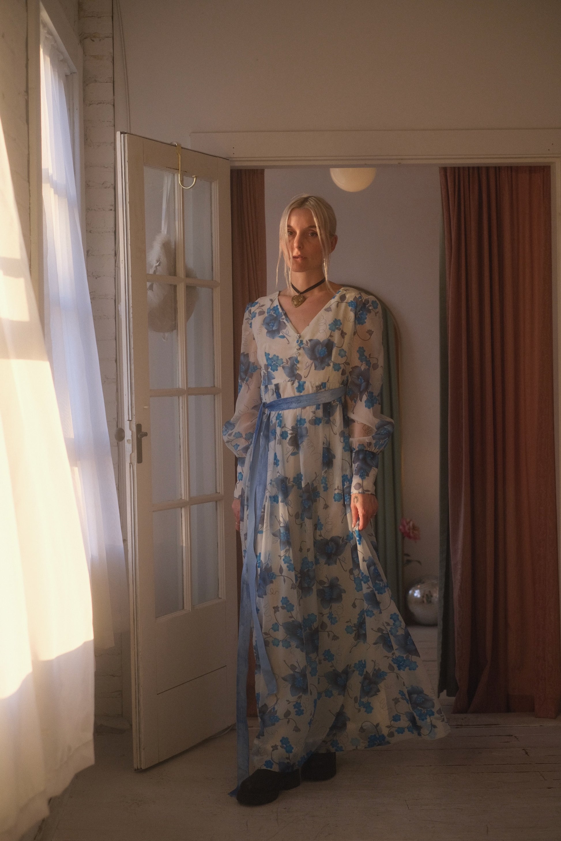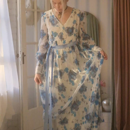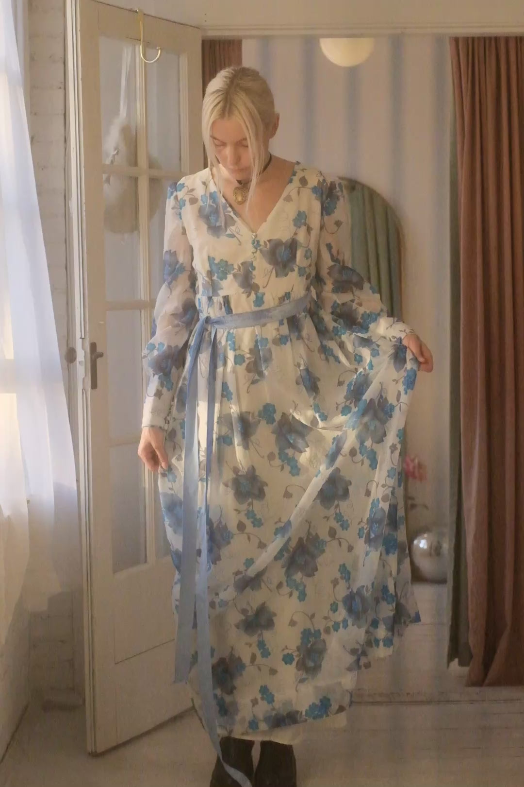 Darling floral dress, beautiful poet sleeve, blue velvet ribbon around waist, flowing, romantic skirt, sheer floral layer over too of lining - great condition.