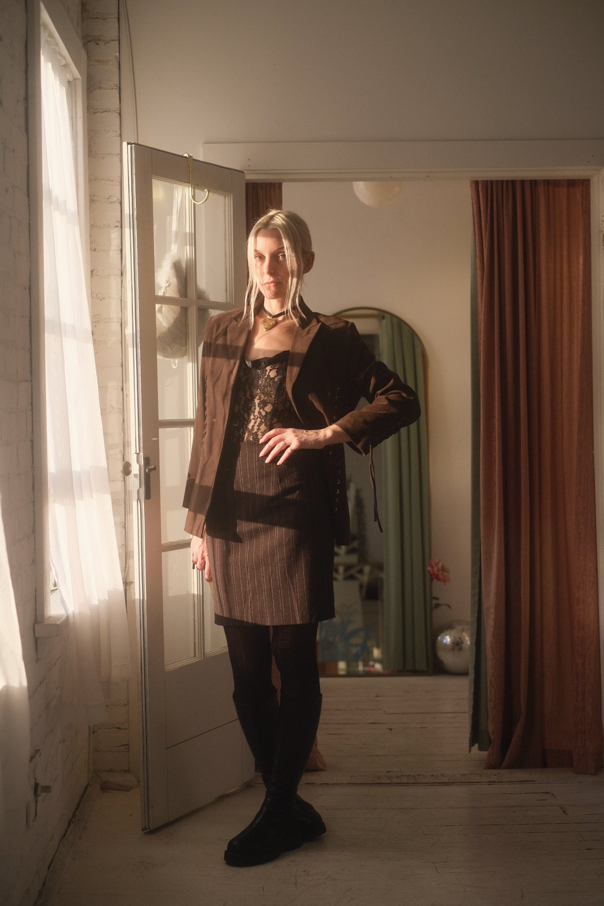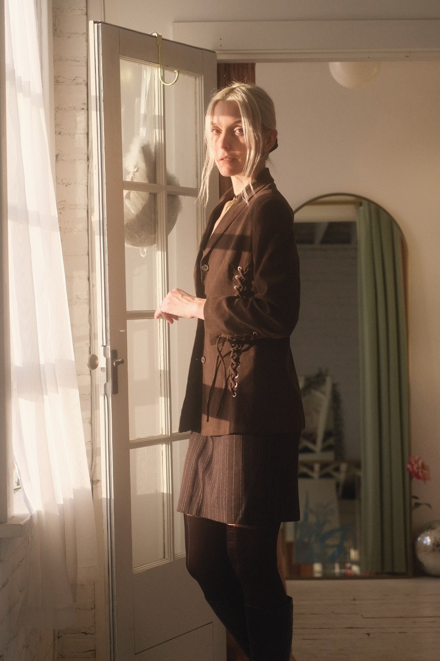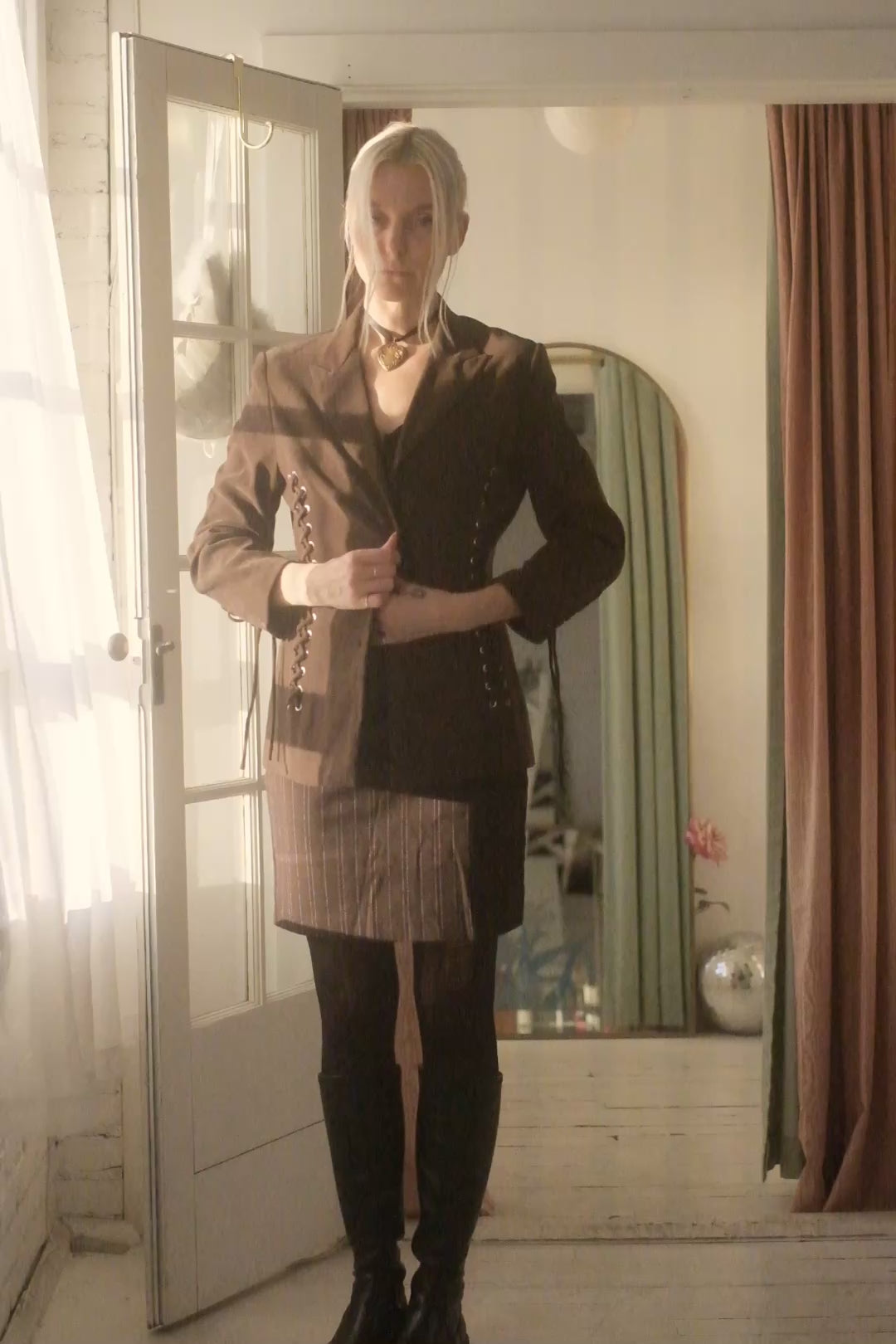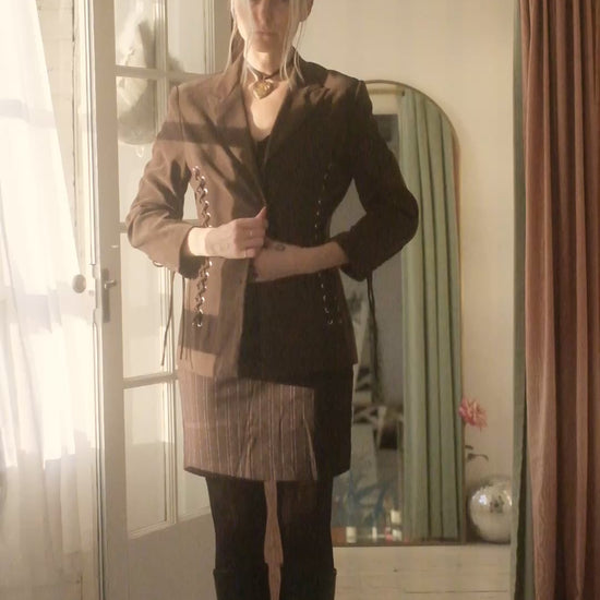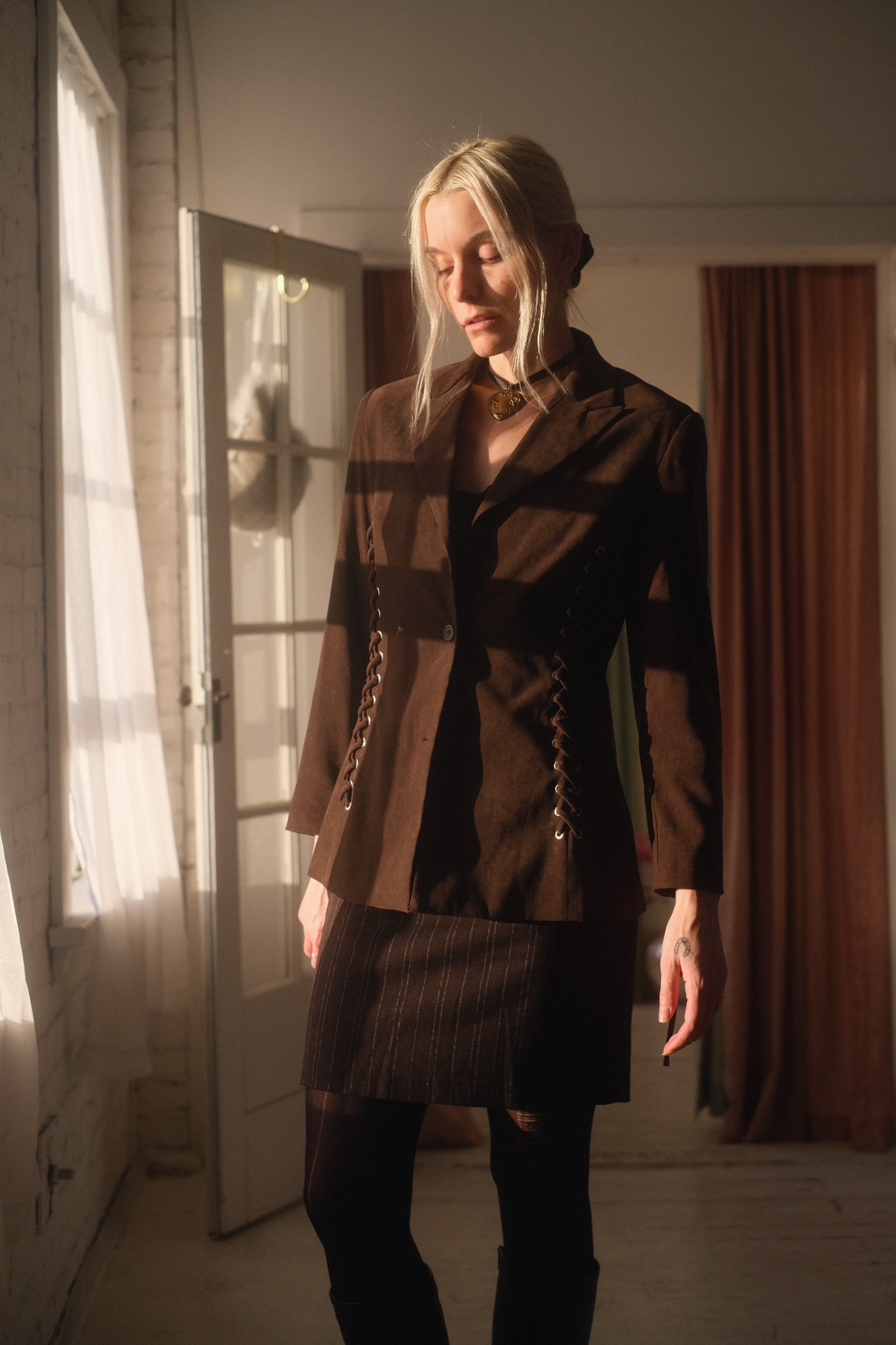 Unique blazer with laze up details at sleeve and sides, a few buttons up front, bit of stretch in an easy faux suede like soft fabric - great condition.