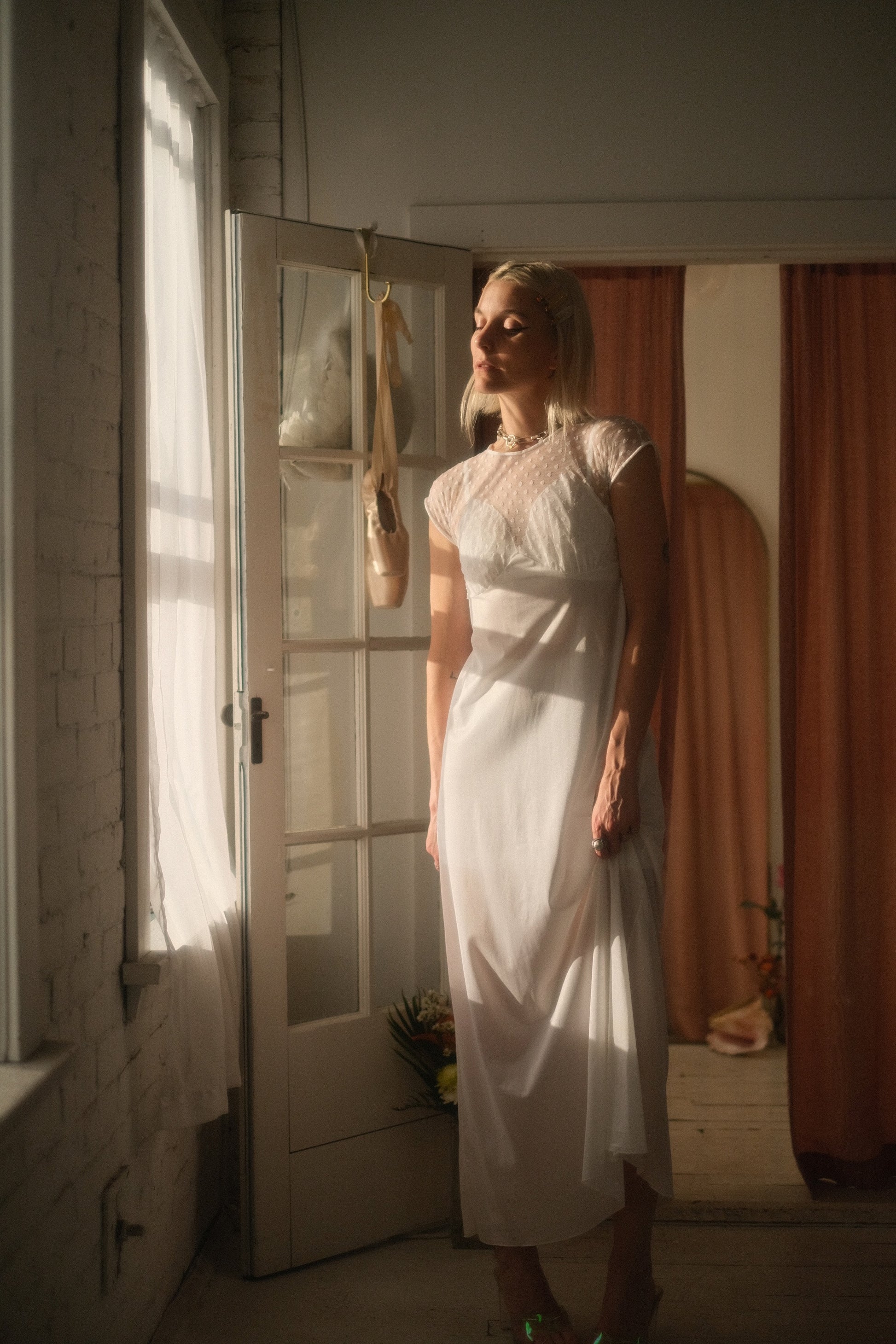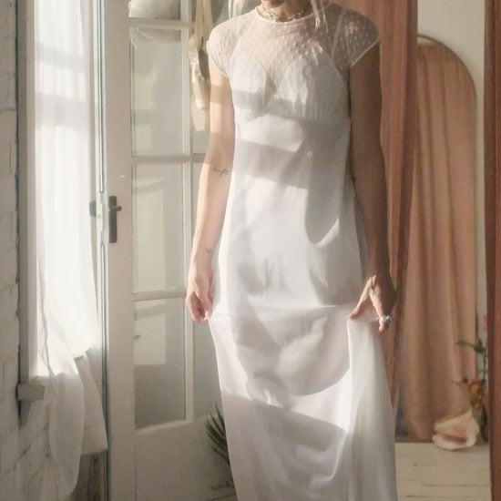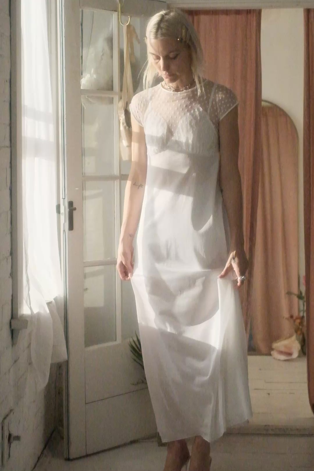 Lovely long lounge dress, simple skirt with a sheer veil dot top and a sweetheart white coverage over bust as shown (not layered with bra, it is built in to dress) - great condition.