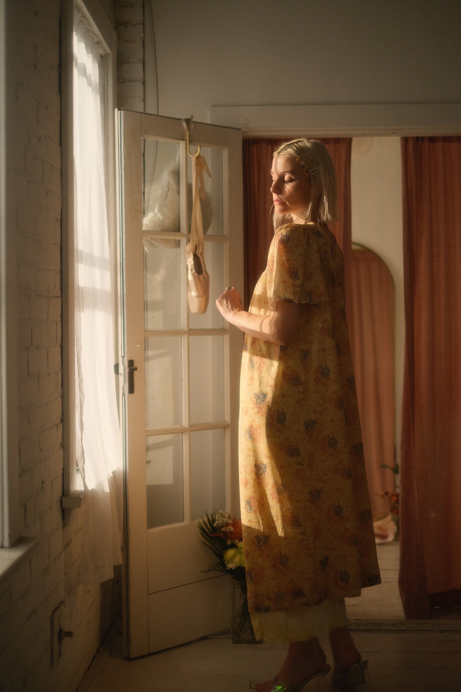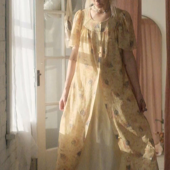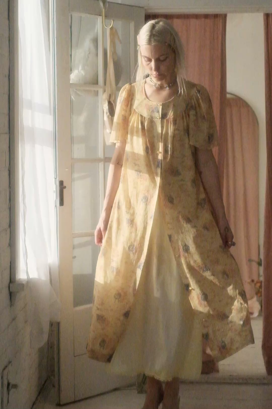 Ultra romantic longe button up, featuring a couple Romantics and a serenade in ye olde forest, palest yellow, wear it open as a little robe if you please - great condition.