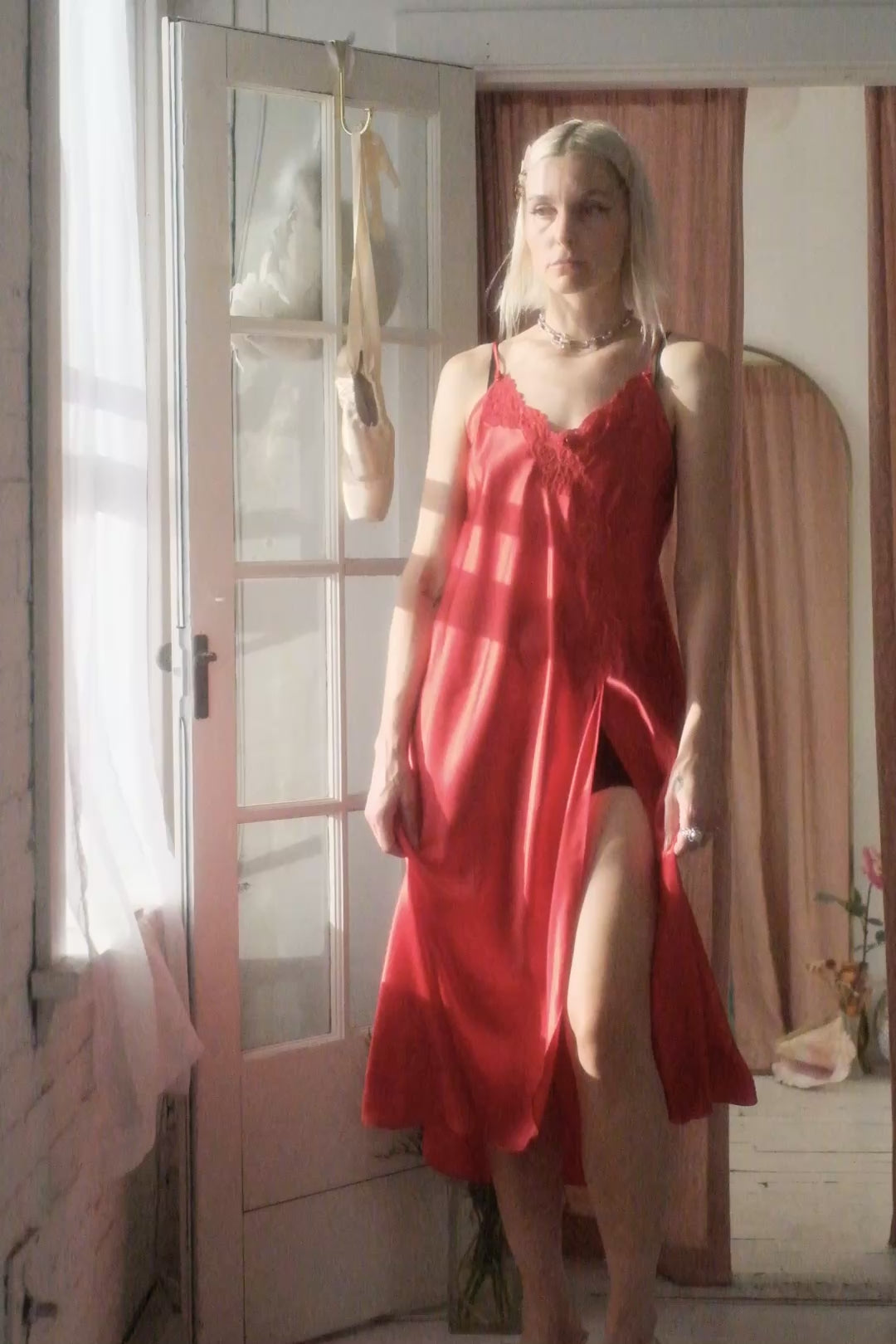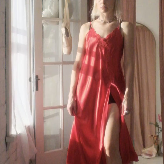 Incredible red satin slip dress, high slit, rose buds place at straps and centre - great condition.