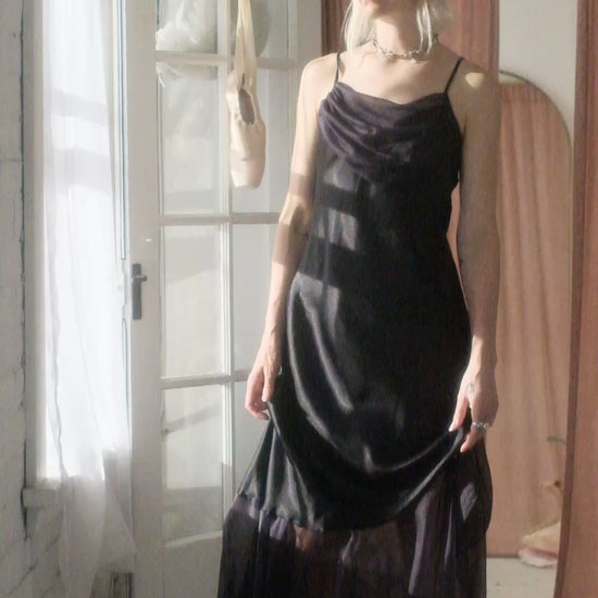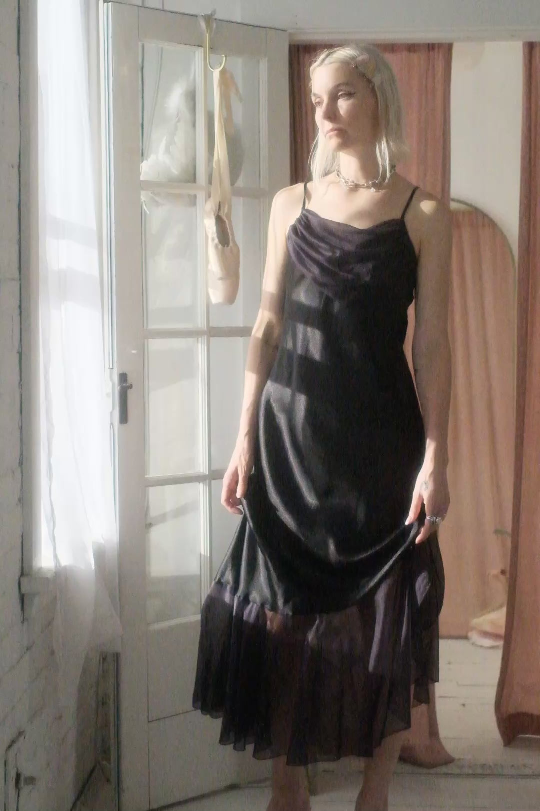 Glamorous lounge dress that could easily be worn out, black satin with wispy draping sheer black hemline and neckline - great condition.
