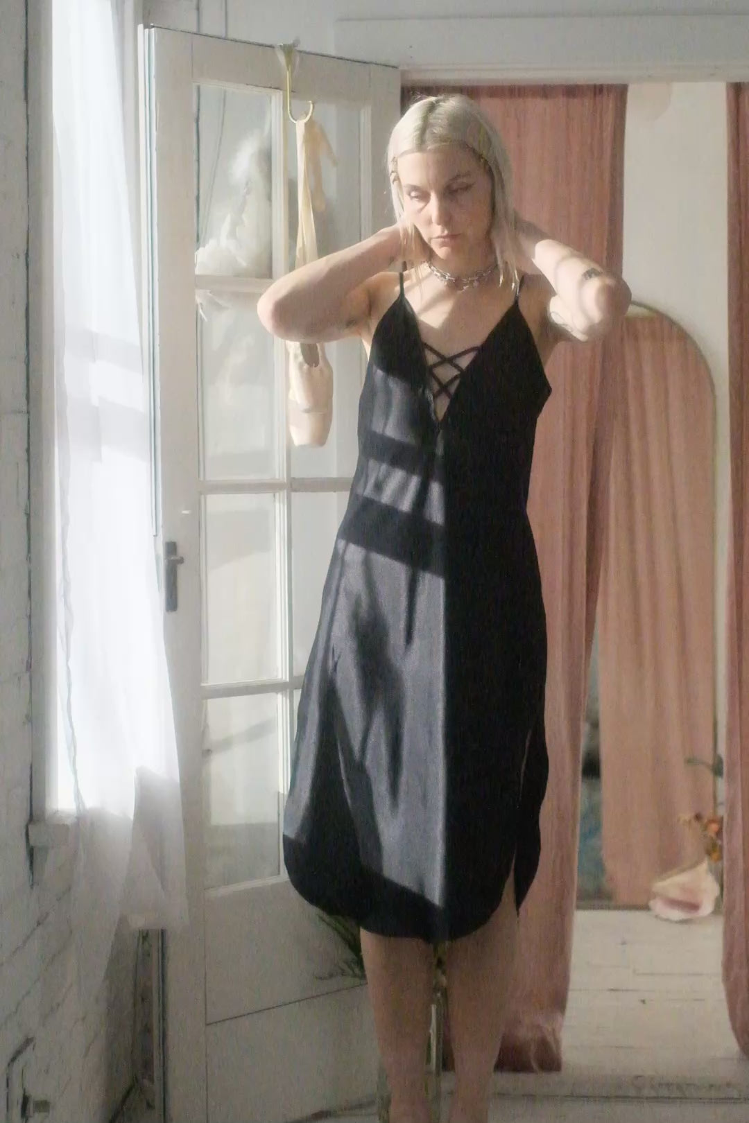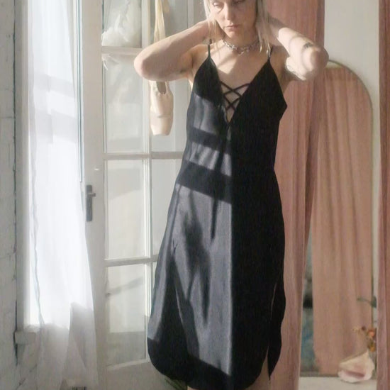 Beautiful black satin slip dress, lace up detail at neckline, slits at side - great condition.