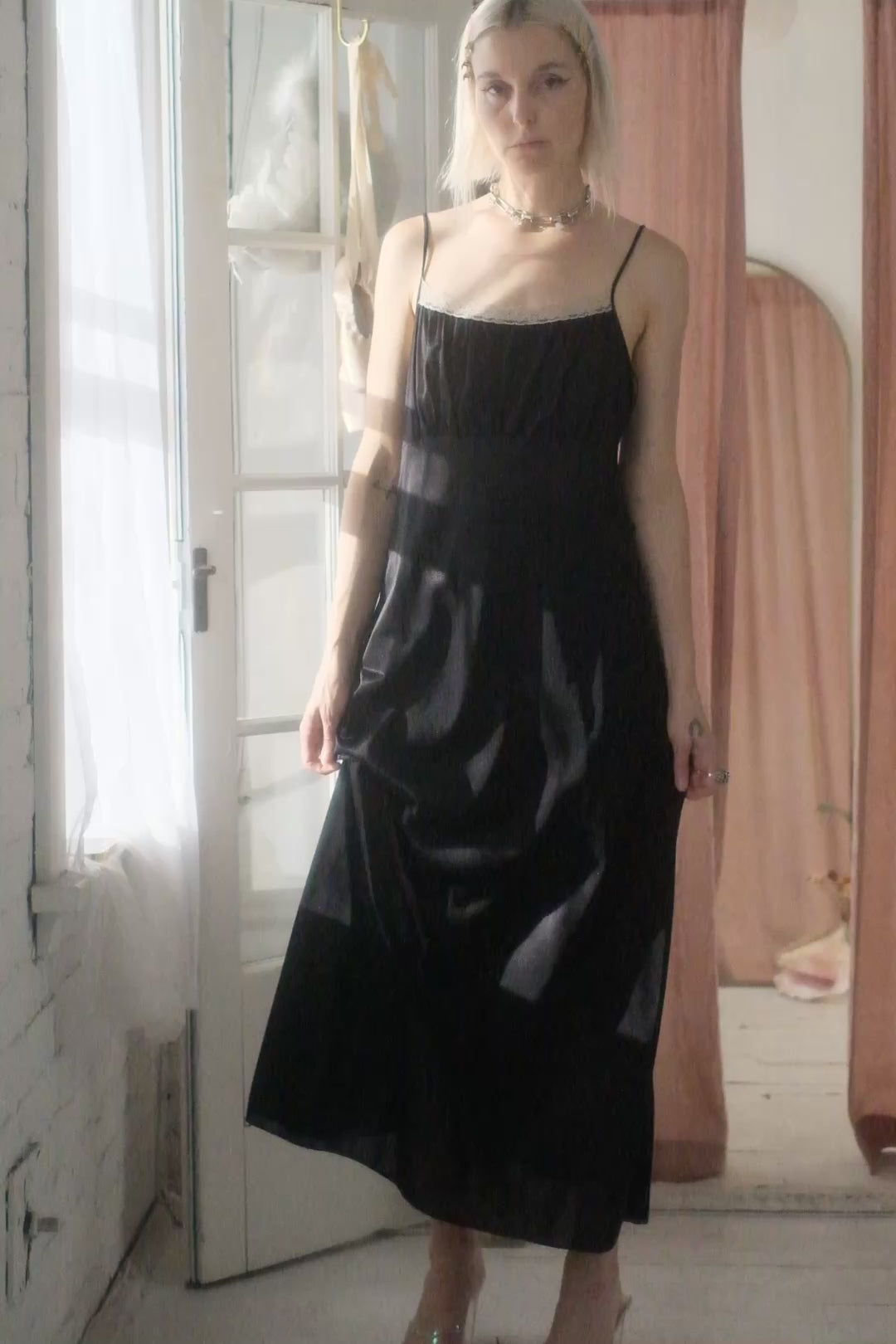 Lovely long slip dress, white lace detail at top, so soft and comfortable but also glamorous - great condition.